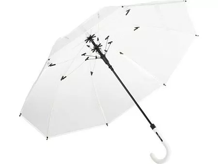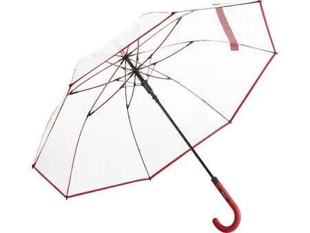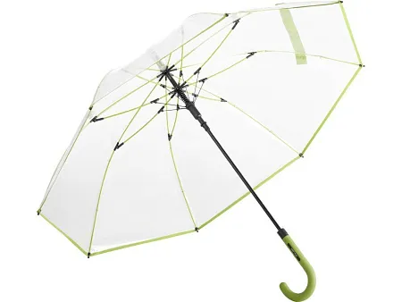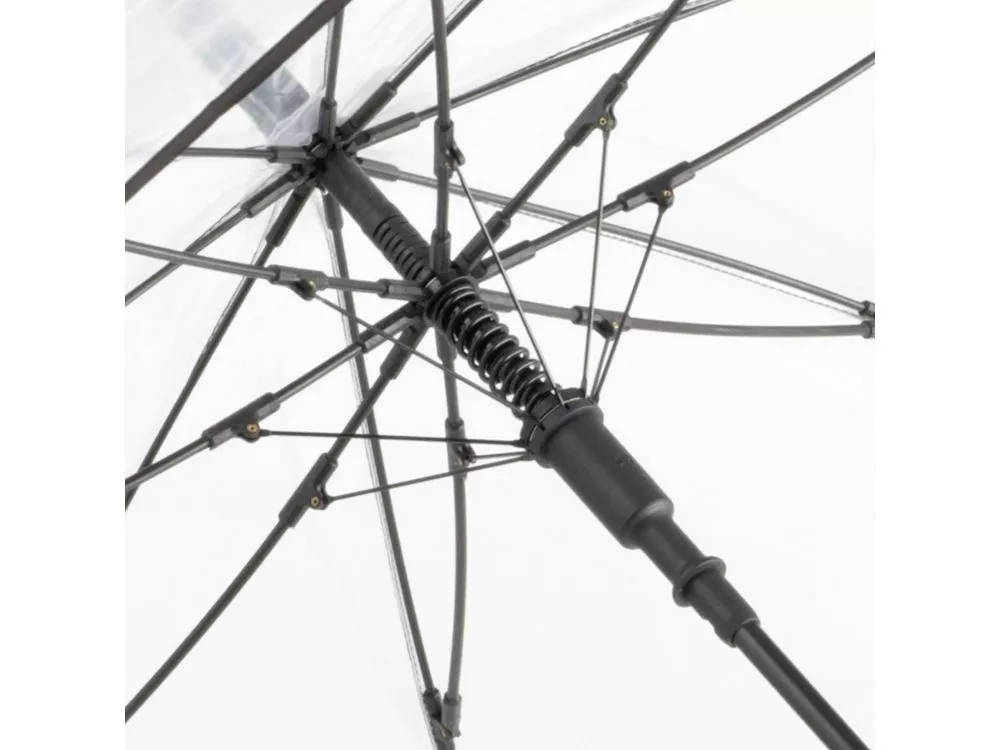 Зонт-трость с прозрачным куполом и контрастными деталями легко открывается нажатием кнопки на ручке. Каркас выполнен из прочной долговечной гальванизированной стали. Благодаря гибким спицам из стекловолокна зонту не страшны порывы ветра.