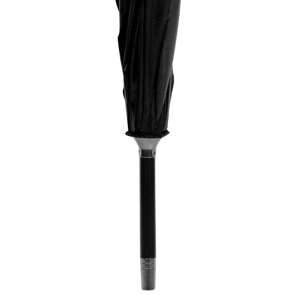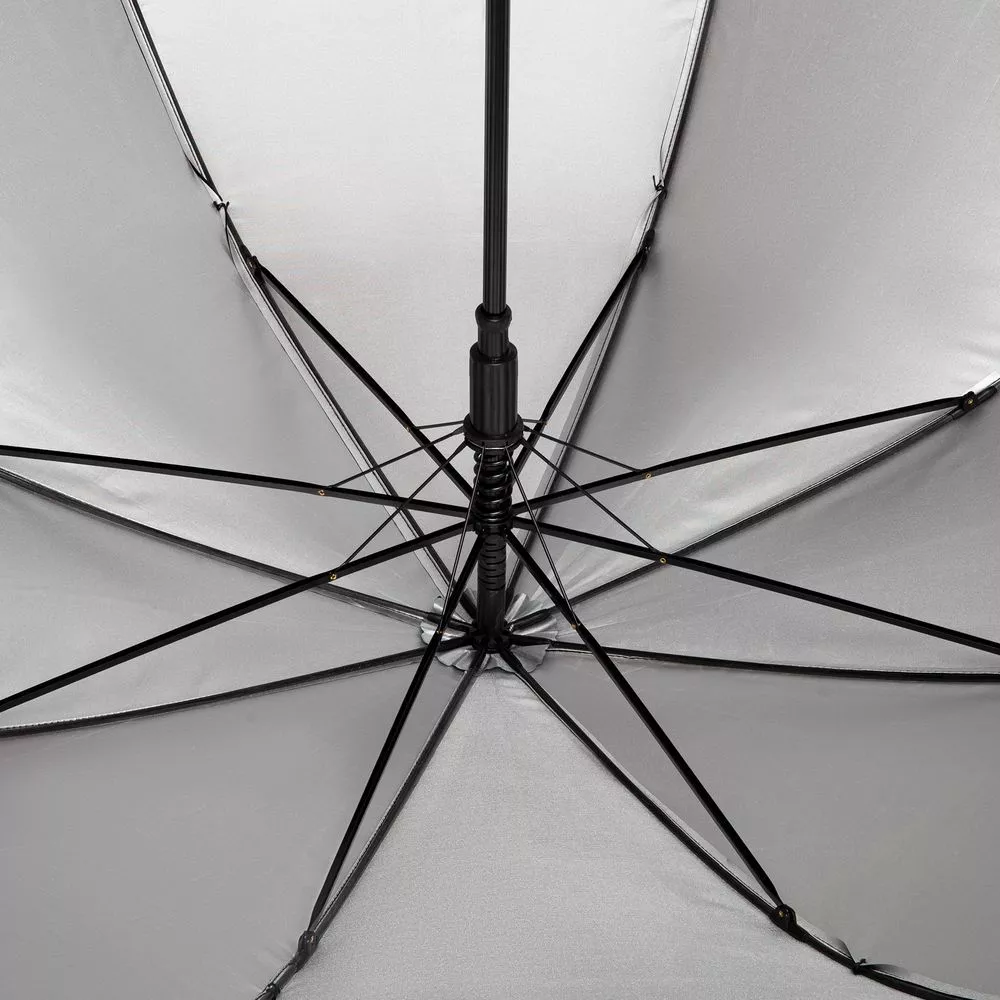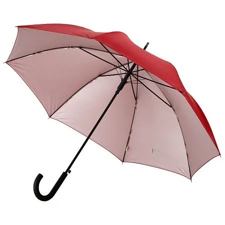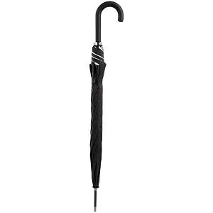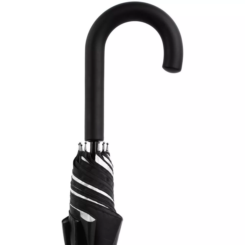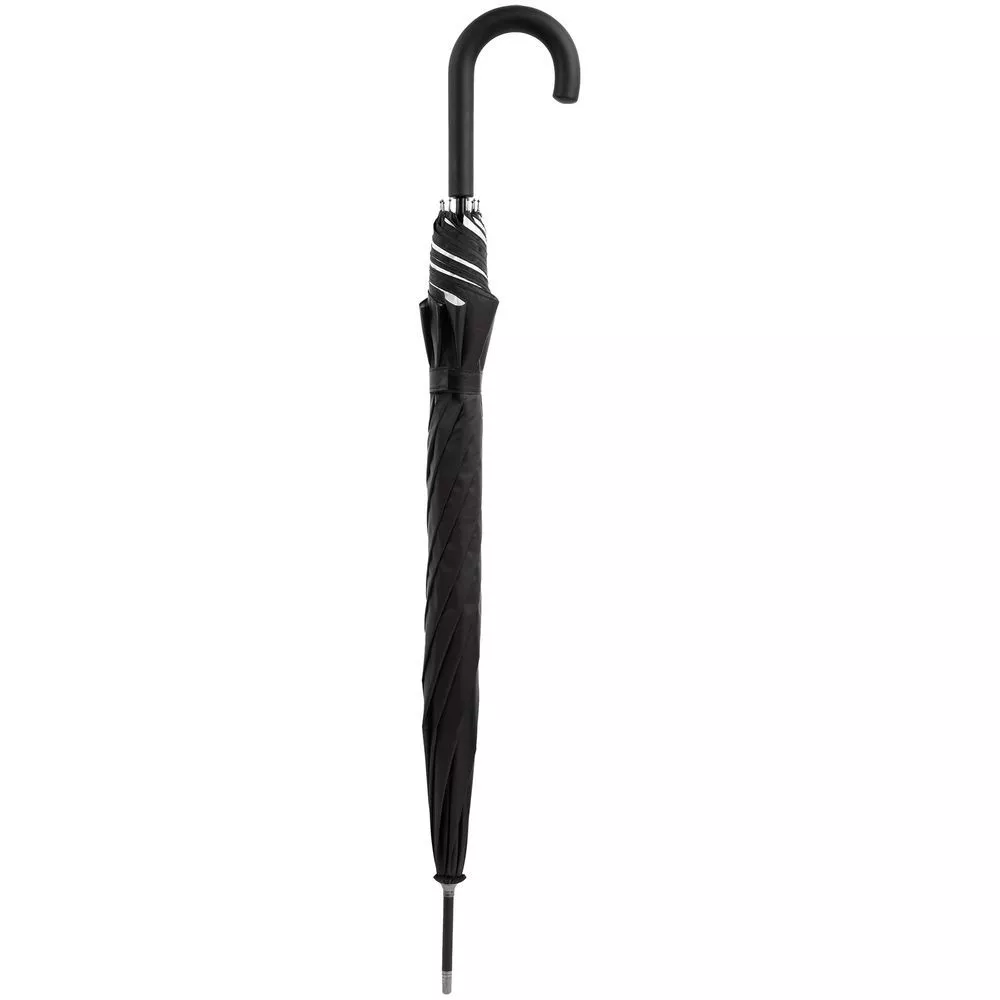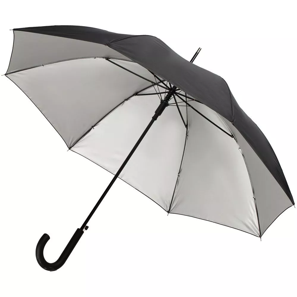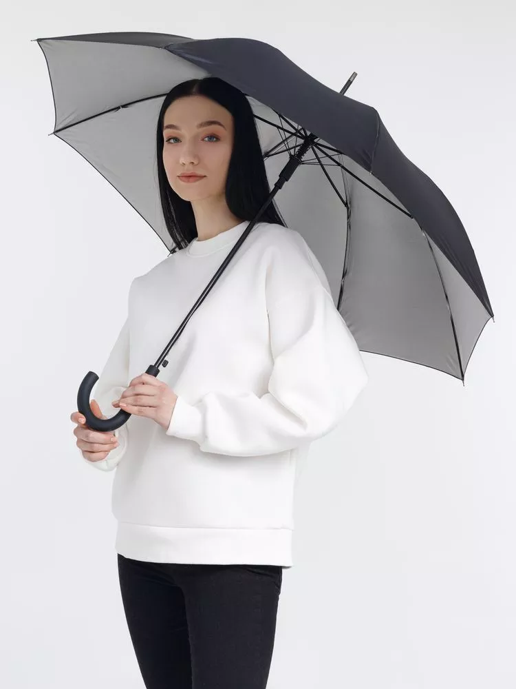 Легкий зонт-трость классической формы, который выглядит не скучно благодаря современным деталям исполнения — серебристому покрытию на внутренней части купола, гибким спицам из стеклопластика, металлическим наконечниками на штоке и спицах, а также мягкой прорезиненной ручке.