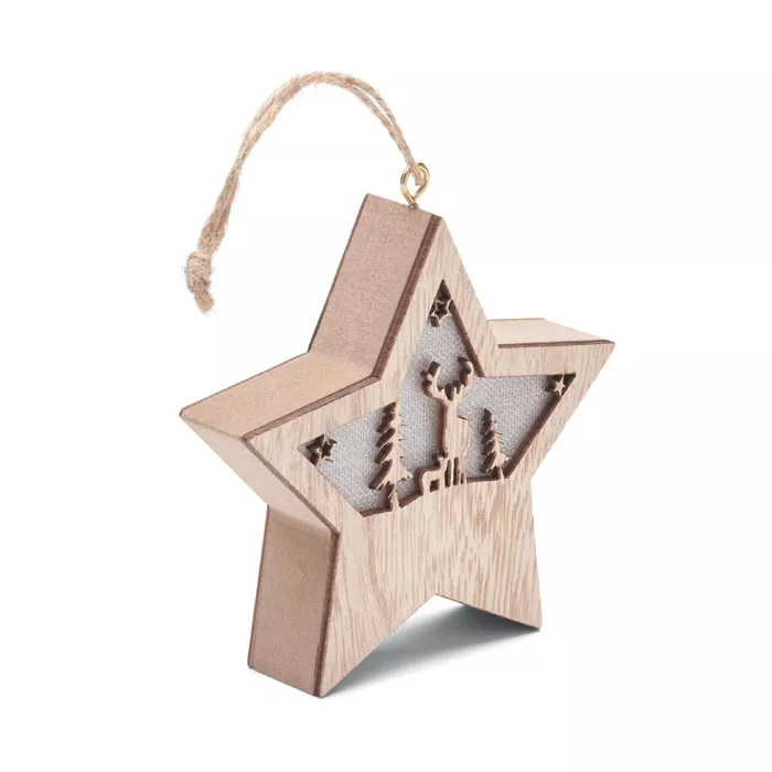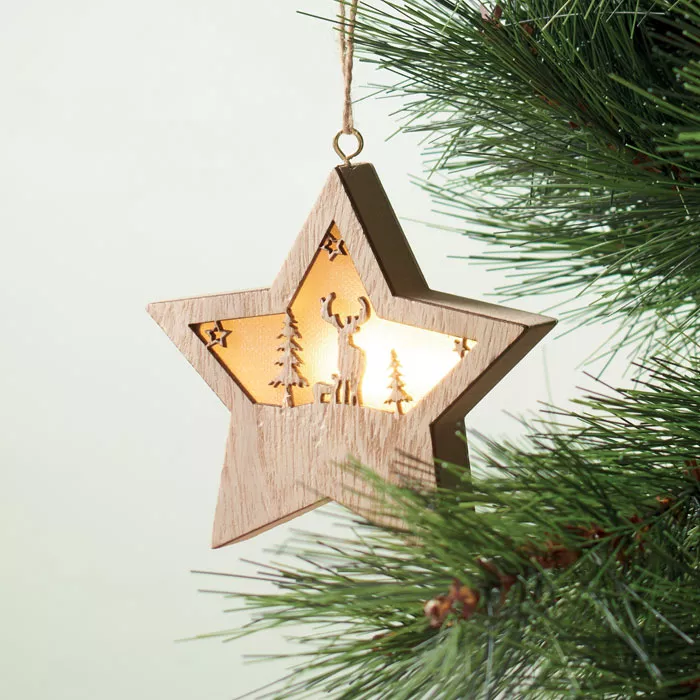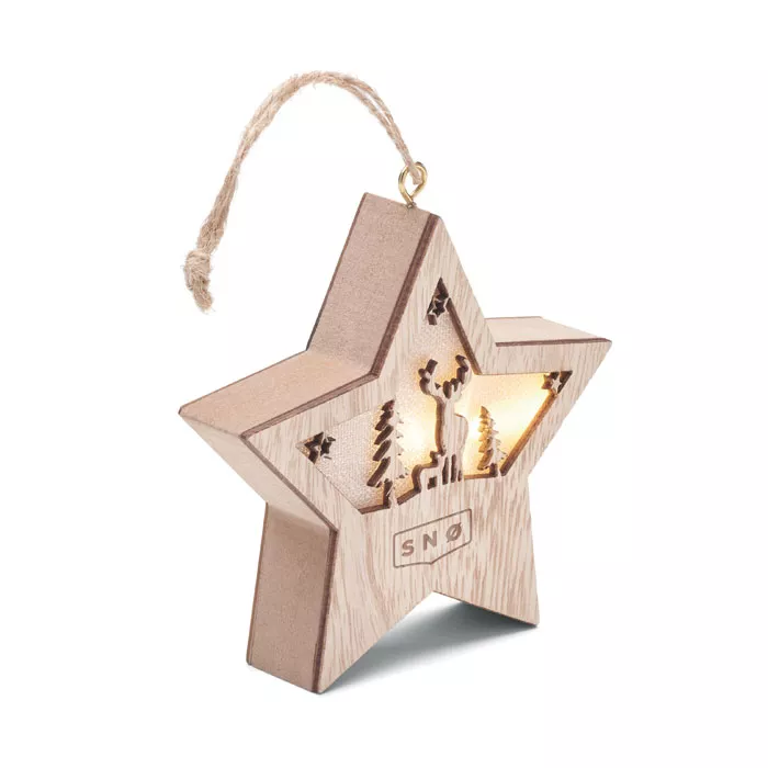 Декорированная рождественская звезда из МДФ со встроенным фонариком и шнурком для подвешивания. В комплект входят 3 батарейки LR44.