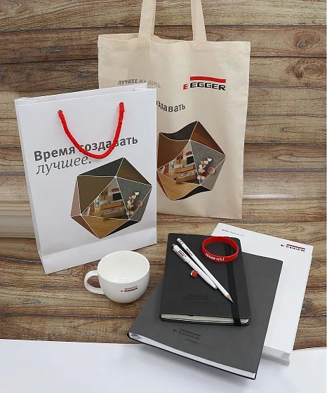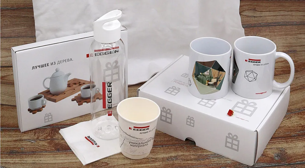Разарботана коллекция премиальной брендированной продукции: элегантный набор посуды с фирменной символикой, кофейные чашки с блюдцами и стеклянные стаканы с логотипом, а также керамические кружки с вдохновляющим слоганом "Время создавать лучшее". Сувенирная продукция разработана в фирменных цветах EGGER.