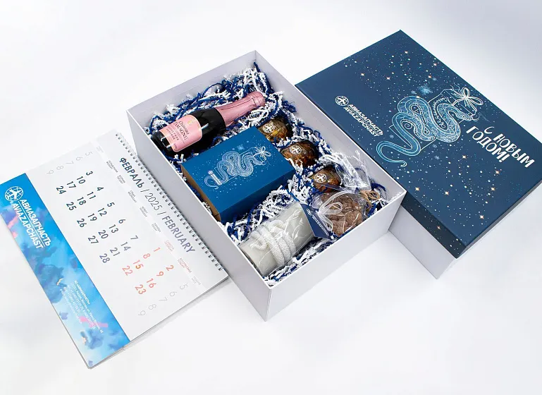 Разработано праздничное оформление подарочного набора, которое объединило фирменный стиль клиента и символику наступающего года. В состав набора вошли: бутылка премиального игристого вина, коллекция изысканных лакомств, ароматическая свеча и фирменный настенный календарь. Дополняет набор декоративный бело-синий наполнитель, создающий эффект праздничной "снежной" подушки