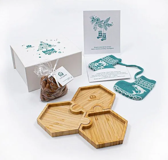 Разработан корпоративный подарочный набор, включающий комплект бамбуковых менажниц, которые могут использоваться как индивидуально, так и в составе единой сервировочной конструкции. Дополняют подарок орешки и открытка-конверт с поздравлениями и маленькими вязаными варежками — елочными игрушками. Набор выполнен в строгом соответствии с фирменным стилем Заказчика.
