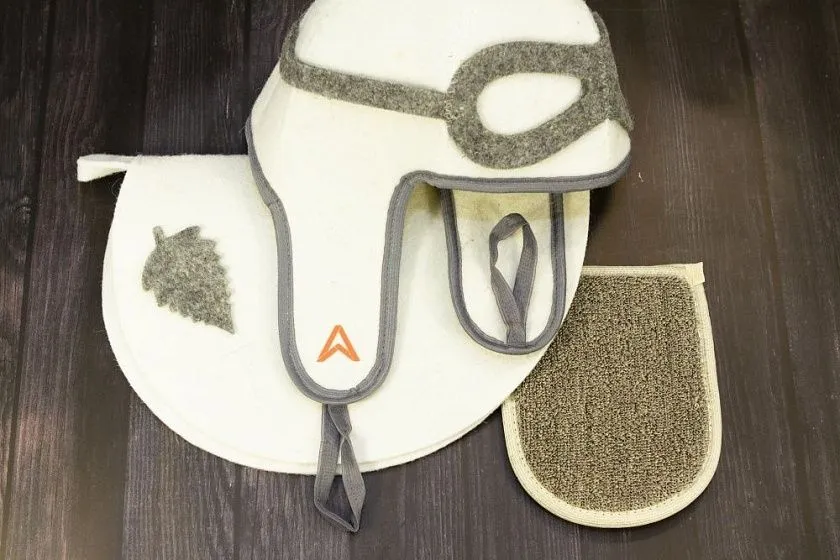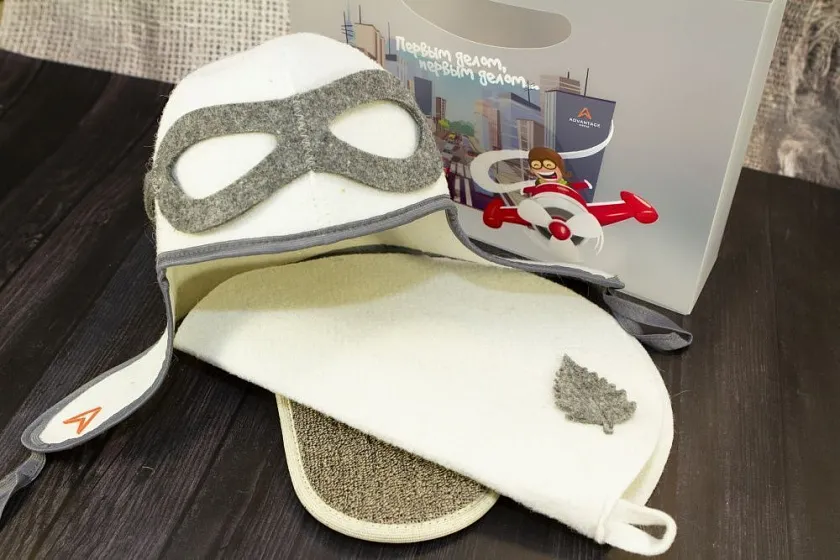 Для ежегодного подарка был выбран банный набор. Его особенностью стала необычная шапочка для бани и сауны в виде шлема пилота самолета с имитацией очков.
