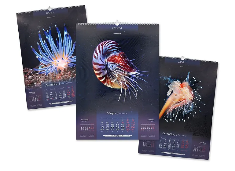 Разработан настенный календарь, воплощающий красоту подводного мира. Основу дизайна составили тщательно отобранные фотоизображения обитателей морских глубин, предоставленные заказчиком. Для придания изделию объема и уникальной текстуры применили технологию выборочного УФ-лакирования, подчеркивающую детали изображений. Особое внимание было уделено цветопередаче благодаря изготовлению индивидуальных цветопроб и их согласованию с заказчиком. Внедрив многоступенчатый контроль качества на всех этапах производства, мы исключили цветовой разнотон и достигли максимальной точности воспроизведения.