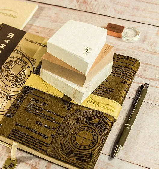 Подарочный набор выполнен в теплых фирменных оттенках — шоколадном и кремовом. В центре композиции — полиграфия премиального качества: большие удобные блокноты в двух форматах с дизайнерской бумагой, обложкой с выборочным УФ-лаком и покрытием софт-тач, а также оригинальный кубарик-лесенка с разными дизайнами каждой ступени. Особое внимание привлекает стильный календарь с индивидуальным блоком, выборочным УФ-лаком на топе и двумя курсорами — статическим и магнитным. Завершают набор: мягкий плед и кружка с софт-тач ламинацией и вдохновляющим слоганом «Генератор тепла» в крафтовой упаковке.