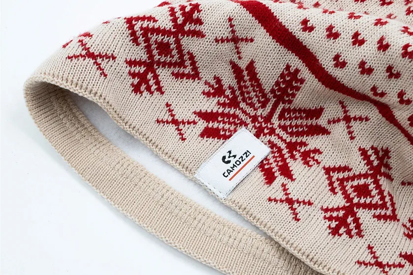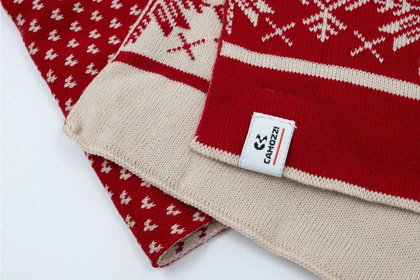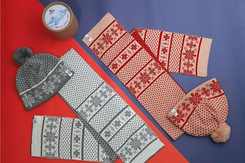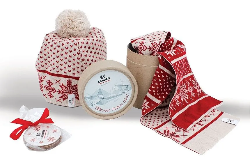 Разработан зимний набор, включающий вязаную шапку с помпоном и шарф с праздничным узором, дополненный упаковкой в эко-формате. Дизайн изделий выполнен в корпоративных цветах с традиционными зимними мотивами, создавая ощущение уюта и тепла. В комплект также входят брендированные подставки под горячее.