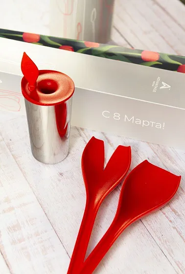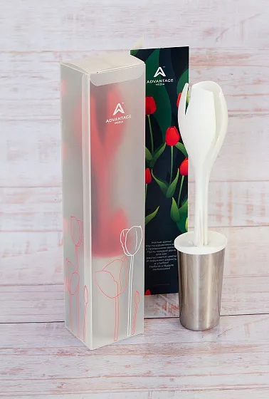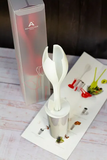 Цветы для праздника 8 марта являются самым приятным подарком и символом приближающегося тепла и цветения. Для поздравления клиенток был выбран необычный набор для салата в виде тюльпана. Интересной изюминкой подарка служила упаковка, которая представляла собой полупрозрачный бокс с уф запечаткой.