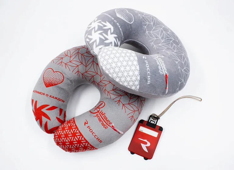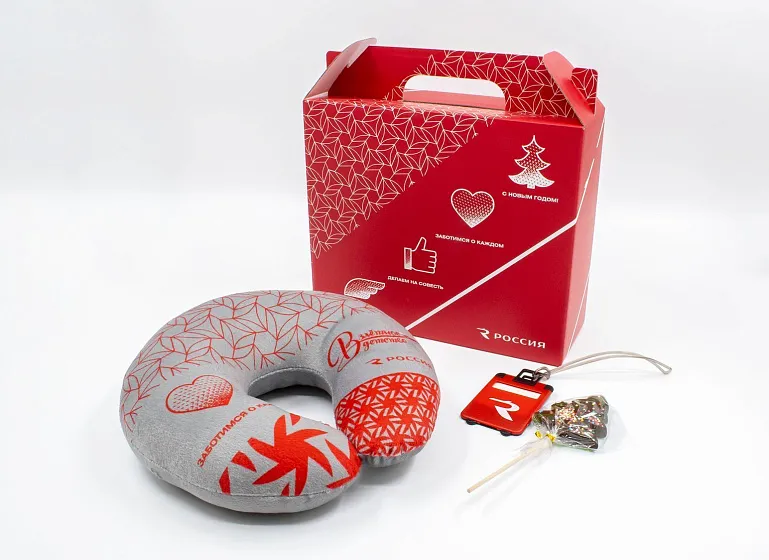 Для набора были предложены тематические сувениры, которые могут пригодится в полете. Это удобная подушка для головы, бирка для чемодана и новогодний символ - ёлочка в виде леденца, всегда актуальная сладость, чтобы не закладывало ушки при взлетах и посадках.
